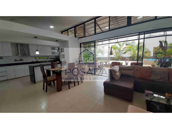 Linda casa de un piso, con área del lote 830 m2, área construida aproximadamente 300 m2, consta de sala comedor, Cocina en mármol negro con mesón, 3 alcobas con baño y closet, la principal con vestier y jacuzzy, 2 bodegas pequeñas, zona húmeda de la casa consta de sauna, turco y jacuzzy, en total 5 baños y el social, parqueadero cubierto para 2 vehículo y capacidad para 10 vehículos. El conjunto cuenta con piscina de adultos y niños, jacuzzy, cancha de voleibol en arena, cancha múltiple, Mesa de ping - pong, Juegos infantiles, vías en concreto, parqueaderos de visitantes, áreas sociales arborizadas.